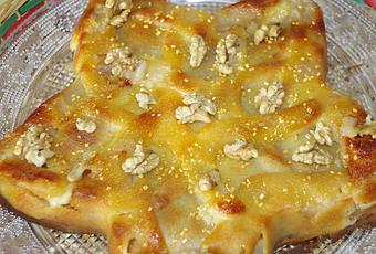 Ayant des poires et des noix à la cave, je les ai utilisés pour faire ce gâteau. La pâte est faite au "pif" !