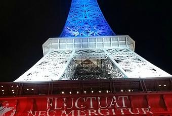 Hier soir, nous avons vu la Tour Eiffel qui avait enfilé sa tenue bleu, blanc, rouge, avec inscription sa devise "fluctuat nec mergitur" que nous avons pu expliquer aux filles.
