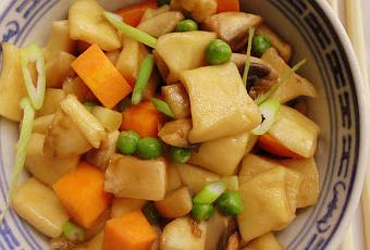Chauffez 1-1.5 litre d'eau dans un fait-tout pour cuire les dés de pâte. Dès que l'eau bout, mettez les dés à cuire pendant 2 à 3 minutes. A la fin de cuisson, rincez les dés sous l'eau claire et égouttez.Rallumez le feu, mélangez les dés avec les légumes précuits à feu fort, ajoutez le reste de sauce soja, si le mélange est trop sec, ajoutez 1 c. à soupe d'eau. Continuez la cuisson pendant 1 à 2 minutes, arrêtez la cuisson et parfumez avec l'huile de sésame.