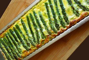 Huiler le moule puis verser la préparation. Disposer les demies asperges les unes à côté des autres sur la pâte aux poireaux et cuire une demie-heure environ.