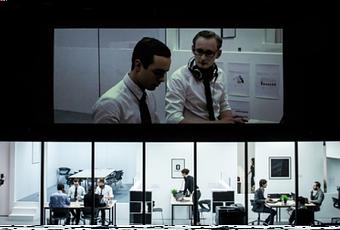 Le tour de force de Nobody réside dans sa forme hybride, qui rend toute la violence du propos : la performance filmique. Une charte de création, créée pour ce genre nouveau, avertit le public : les images sont filmées, montées, et réalisées en temps réel sous les yeux du public, tout comme les musiques et les sons. Sur scène, une boite géante contient le décor, qui illustre magistralement le paradoxe du propos : un open-space, que l’on aura tôt fait de comparer à un aquarium dans lequel on se noie, à un vivarium dans lequel on étouffe. Au-dessus de ce décor plus vrai que nature, un écran, qui retransmet en direct les images filmées par les deux cameramen qui évoluent tels des danseurs au milieu des 17 comédiens sur scène. Tous deux habillés de noir, se mouvant avec élégance et légèreté, ils semblent aériens au milieu d’un monde plus terre à terre que jamais. Un dispositif aussi innovant qu’asphyxiant qui nous embarque dans un plan séquence d’1h30 à nous glacer le sang.