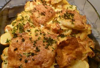 Dans un plat allant au four mettre les pommes de terre puis dessus la morue.