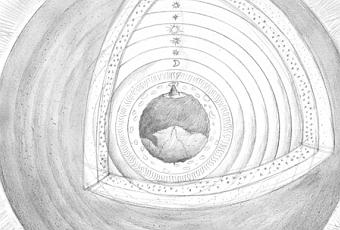 Vue générale du monde dans le Divine Comédie de Dante. La terre est au centre d’un cosmos sphérique. Autour d’une terre sphérique, on distingue les neuf cieux, l’Empyrée et la Rose céleste.
