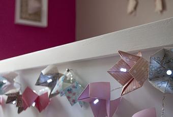 C’est le dernier mercredi du mois et donc le jour du Projet DIY. Ce mois-ci, le thème était « Imprimés fleuris ». J’avais tout plein d’idées… J’ai finalement décidé de faire une petite guirlande lumineuse pour agrémenter le lit tout blanc de la Poulette.