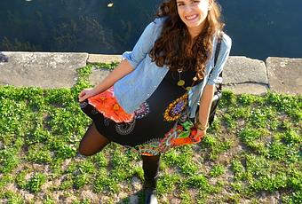 Pour ce premier look, je porte la robe Felicia, avec une chemise en jean, des collants semi-opaques et mes bottes motardes. J'ai adoré porter cette tenue, je me suis sentie à l'aise et sûre de moi, la robe possède des imprimés féeriques aux couleurs chatoyantes et est très bien coupée, resserrée à la taille puis évasée, parfaite pour les morphologies en 8 ou en X.