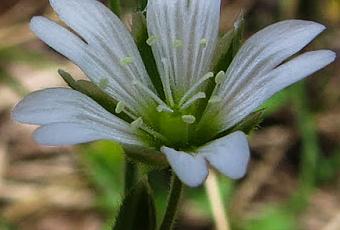 Cerastium arvense, Céraiste des champs : herbacée annuelle ou vivace à feuilles opposées, linéaires lancéolées, fleurs à pétales blancs plus ou moins profondément échancrés, étalés et recourbés, 2x aussi longs que les sépales, sépales et bractées à bords parcheminés, 5 styles (comme ma plupart des Cerastium, ce qui permet de les différencier des Stellaria qui ont seulement 3 styles)