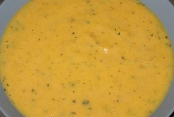 En fin de cuisson, ajouter la crème et mixer le tout à l'aide d'un pied à soupe. Ajouter le basilic.
