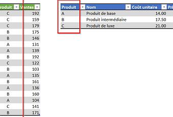 Ce type de relation est le plus commun. Il s’agit d’une relation entre une table où chaque élément de la clé commune entre les deux tables n’est présent qu’une seule fois dans la table (c’est le côté représenté par le One) et une table où chaque élément de la clé commune peut être présent plus d’une fois (c’est le côté représenté par le Many). Dans l’exemple ci-bas, la clé commune entre les deux tables est le code de produit (A, B, C). Les codes de produits apparaiseent plusieurs fois dans la première table, soit la table de transactions de ventes et chaque code de produit n’apparaît qu’une seule fois dans la table de dimension de produits. Nous pourrions donc créer une relation Many to One entre ces deux tables.