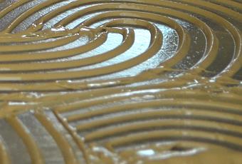 " La colle Blanchon s'applique à la spatule. On va ouvrir le coin de l'emballage pour pouvoir avoir un débit de colle que l'on va maîtriser lorsque l'on va pousser sur la poche. Ensuite, on va spatuler, en respectant le geste du parqueteur, c'est-à-dire en formant un 8. La spatule va réguler la quantité de colle nécessaire, on va jongler entre une spatule n°3, 4 ou 5 en fonction du grammage que l'on va vouloir apporter. "