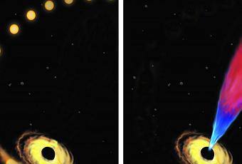 A gauche, illustration d’une étoile spiralant vers un trou noir supermassif. Les forces de marée de ce dernier l’étirent jusqu’à l’effilocher et l’enrouler autour de l’horizon des événements. A droite, un jet de plasma se forme à partir d’une partie des débris de l’astre — Crédit : Amadeo Bachar, ICRAR