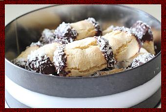 Aujourd’hui, les Mandelstangen, de petits biscuits à base de poudre d’amandes. Sensation de légèreté grâce au blanc d’oeuf incorporé un peu comme dans la recette des étoiles à la cannelle. Une pâte légèrement meringuée avec en prime les saveurs du chocolat et de la noix de coco. Viel Spaβ !250 g poudre d’amandes 240 g sucre glace 1 sachet de sucre vanillé sel 2 c.s de farine 1 oeuf 20 g noix de coco en poudre 100 g chocolat noir 1 c.s crème fraiche Séparez le blanc du jaune. Mélangez les sucres, la farine, la poudre d’amandes, le jaune d’oeuf et le sel. Montez le blanc en neige. Incorporez délicatement au mélange puis formez une boule de pâte. Laissez reposer pendant 20 minutes. Préchauffez le four therm.6 (180°). Coupez la boule de pâte en deux et formez deux rouleaux de 1,5 cm de diamètre. Découpez des morceaux de 5 cm de long et déposez-les sur une plaque recouverte de papier sulfurisé. Mettez au four pour 10 minutes. Les biscuits vont prendre une couleur légèrement dorée. Laissez tiédir. Pendant ce temps, faites fondre le chocolat avec la crème fraiche au bain-marie. Lorsque la ganache est à température ambiante, trempez les extrémités de chaque biscuit dans la ganache avant de saupoudrer de noix de coco. Laissez refroidir et conservez dans une boite en métal jusqu’à la dégustation. Mon grain de sel Une recette de biscuits trouvée dans le magazine Essen & Trinken. Mémo en V.O. :
