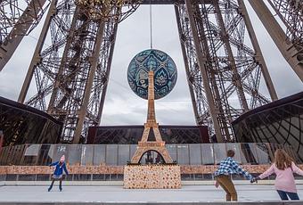 Une patinoire ludique placée sous le signe du développement durable Cet hiver, la patinoire du 1er étage de la tour Eiffel fait un clin d'il à la COP21. Palettes de bois et matériaux recyclés composent le mobilier du bar de la patinoire. Une tour Eiffel en bois de 6m de haut habille l'espace. Point idéal pour des photos souvenir !