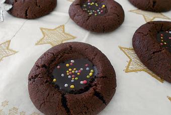- Préparer le glaçage : dans un bol mélanger le cacao et le sucre glace puis ajouter la vanille et l’eau. Ajuster éventuellement un peu d’eau afin d'obtenir un glaçage ni trop épais, ni trop liquide. Garnir les puits des biscuits de glaçage et avant qu’il ne durcisse saupoudrer de billes colorées.