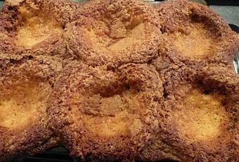 J’avais pourtant respecté les proportions d’un quatre-quarts à l’orange : beurre, farine et sucre à égalité (115 g.), 2 œufs, une cuillerée à café de levure chimique, le jus et le zeste finement haché d’une orange non traitée et 35 minutes à 160°. Mais, et tout est dans le « mais », je n’ai pas choisi le moule convenable. J’avais imaginé des petites alvéoles pour faire des cupcakes, et je les ai trop remplies.