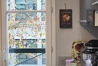 Mon choix s’est porté sur une cuisine Ikea mais j’ai surtout voulu mixé du blanc et du gris. Pour ce qui est du plan de travail, il est en quartz de chez Silestone. Mais je ne pense pas que je remettrai ce type de matériau dans ma future cuisine. Très joli mais cela ne tient pas ses promesses en terme de qualité…