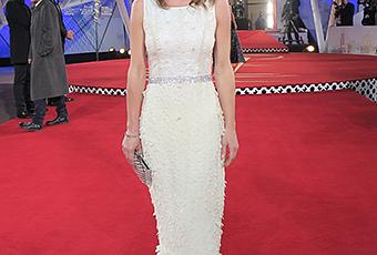 La comédienne Emmanuelle Boidron dans une robe sirène écrue dont la jupe est composée de pétales découpés au laser griffée Christophe Guillarmé, des boucles en diamants et amethystes Mounier & Bouvard, minaudière Carmen Steffens, coiffure L'Oréal Professionnel Maroc.