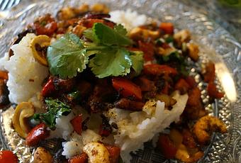 - Faire chauffer le Beurre, dans un Wook, y faire rissoler, l'Échalote et le Poivron. Saupoudrés des Épices : Curry, Gingembre, Piment et les Graines de Cardamome (casser la capsule et récupérer les graines à l'intérieur), ajouter les Noix de Cajou. Remuer, vivement et surveiller pour donner une jolie coloration à l'ensemble, compter environ 4 à 5 minutes à feu moyen.