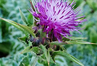 Silybum marianum (Chardon-Marie) : espèce mésoxérophile très rare en Lorraine dans les sites rudéralisés, bractées du capitule prolongées par une longue pointe épineuse, feuilles marbrées de blanc et bordées d'épines.