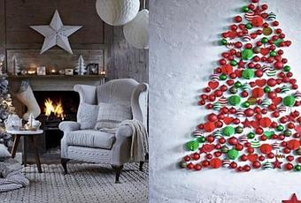 Dans le même esprit que le précédent mais plus coloré, accrochez directement vos décorations sur le mur en reprenant les formes du sapin.