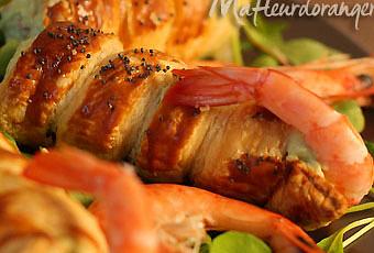 Disposer les roulés sur un lit de salade verte et décorer de crevettes entières.