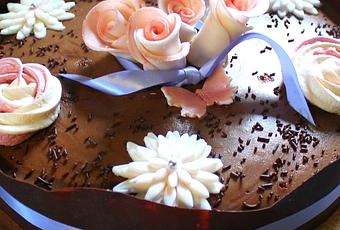 Pour le monde, mettre donc le biscuit succès au fond du monde. Ajouter un peu de mousse au chocolat (1/3) pour le recouvrir complètement. Disposer le disque de meringue et recouvrir du reste de mousse au chocolat (2)3). Laisser prendre au frigo plusieurs heures. Pendant ce temps vous pouvez réaliser vos décos en pâte à sucre. 1h avant de servir, faire le tour en chocolat en faisant fondre du chocolat au bain-marie. L'étaler bien finement sur du rhodoïd ou à défaut une bande de papier sulfurisé (mais le papier sulfurisé est très fin donc difficile à faire tenir debout. Faire cristalliser (frigo rapidement). Décercler votre gâteau délicatement et enrouler la bande de chocolat tout autour. Remettre au frigo jusqu'au moment de servir, il faudra à ce moment retirer le rhodoïd ou le papier sulfurisé. Décorer avec les rubans et les meringues.