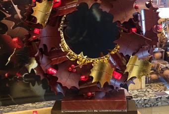 Pour célébrer avec magie cette fête 2015, Le chef chocolatier a créé une superbe pièce artistique en édition limitée, composée de 84 feuilles de houx en chocolat noir finement perforées de quatre tailles différentes. Les finitions sont naturelles, vernies ou recouvertes d’or, habillant deux disques de chocolat entièrement tapissées de fruits du mendiant recouverts d’or . La couronne est décorée de boules de chocolat noir peintes en rouge, 100 feuilles d’or 23 carts et ruban. En boutique 1 400 €