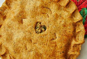 Répartir uniformément le mélange de millet dans la pâte. Faire des incisions dans la deuxième abaisse pour laisser échapper la vapeur lors de la cuisson. Recouvrir la garniture. Bien sceller en écrasant le rebord à l'aide d'une fourchette ou avec les doigts. Badigeonner de lait de soya