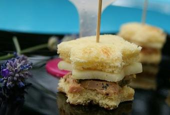 6/ Assemblage : commencer par une étoile de toast brioché au foie gras puis placer l'étoile de pomme granny Smith et terminer par une étoile de toast de pain brioché.