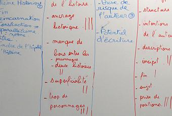 Nous avons en premier lieu listé sur un tableau tous les points forts et les points faibles de chaque manuscrit. Titre, histoire, personnages, structure, cohérence, style, français, profondeur... ce qui devait être retravaillé, tout y est passé pour que chacun se rende compte du potentiel de chaque texte et de la responsabilité de prendre une décision, de voter.