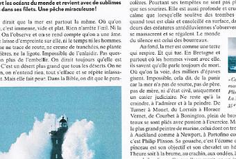 "(...) aujourd'hui le plus grand peintre de la marine, celui dont on trouve les oeuvres à Auckland comme à Newport, à Portofino comme à Cowes, c'est Philip Plisson. Sa gouache, c'est l'écume des vagues, son pinceau est son objectif et son chevalet un hélicoptère. (...) Dans cet album autobiographique, il nous accompagne partout où la vie l'a emmené, de la Trinité à Venise, du Bosphore à la mer d'Andaman, de l'Inde aux Amériques...Magnifique." (G. Martin-Chauffier)