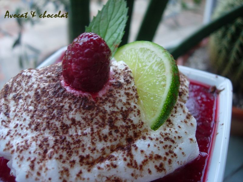 Déposer sur le coulis de framboise, menthe, citron vert, un nuage légèrement meringué.