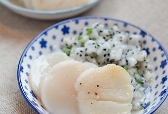 Voilà un amuse-bouche qui avait retenu toute mon attention lors du Food Show Delhaize l'an dernier, car j’ai toujours été un peu perplexe face au “Fruit du Dragon” (pitaya ou pitahaya de son petit nom) que je trouve assez fade en général. Nous avons appris en le cuisinant qu’il en existait deux variété: à chair rouge et au goût plus prononcé et fruité, parfait en dessert, et à chair blanche - celui que je connaissais pour l’avoir souvent dégusté en Asie - dont le goût plus fin se prête bien à une préparation salée. Le voici donc, travaillé en salsa asiatique pour accompagner une Saint-Jacques: c’est frais, parfumé, fin, équilibré... un chouette amuse-bouche de fêtes!