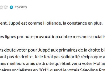 je souris… Voir ce blogueur de gouvernement qu’il était se piquer soudain d’une illusion de Mélenchon, sans grande conviction apparente il faut bien l’avouer, pour atterrir finalement dans le bac à sable de ce libéralisme là, plus brutal qu’on ne le pense généralement lorsqu’on ne se fie qu’aux apparences, même par soi-disant provocation, tout en se revendiquant de gauche, n’est-ce pas amusant ? Surtout quand on réagit sous le prétexte de la constance qu’on a bien du mal à observer soi-même, personnellement… Car moi, je sais contre qui et quoi je lutte. Et je ne vais pas voter aux primaires de droite.