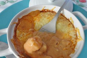 Pour ma part, j'ai pensé au début à un gratiné d'où mon rajout de champignons de Paris avec mes crevettes et donc manger avec une fourchette ... mais au vu du liquide dans le contenant, j'ai préféré prendre une grande cuillère et déguster comme une soupe de poisson ... et au final, avec le râpé fondant et quelques croûtons de pain en accompagnement, cela fait plus penser à ce genre de plat !!