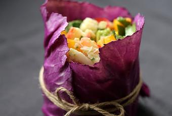 Pour le repas du Reveillon , je vous propose cette salade tout en fraîcheur composée de mangue , d'avocat , de crabe et de coriandre . Rien de bien compliqué mais avec une présentation qui la rend tout de suite plus festive . J'ai simplement entouré mon petit bol en verre de deux petites feuilles de chou rouge , le tout serré pour une ficelle .
