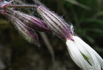 Silene nutans (Silène penchée) : plante velue à souche épaisse, tiges peu ramifiées portant des poils glanduleux visqueux, feuilles inférieures spatulées, les supérieures linéaires sessiles, fleurs blanc crème en panicule unilatérale penché, calice glanduleux