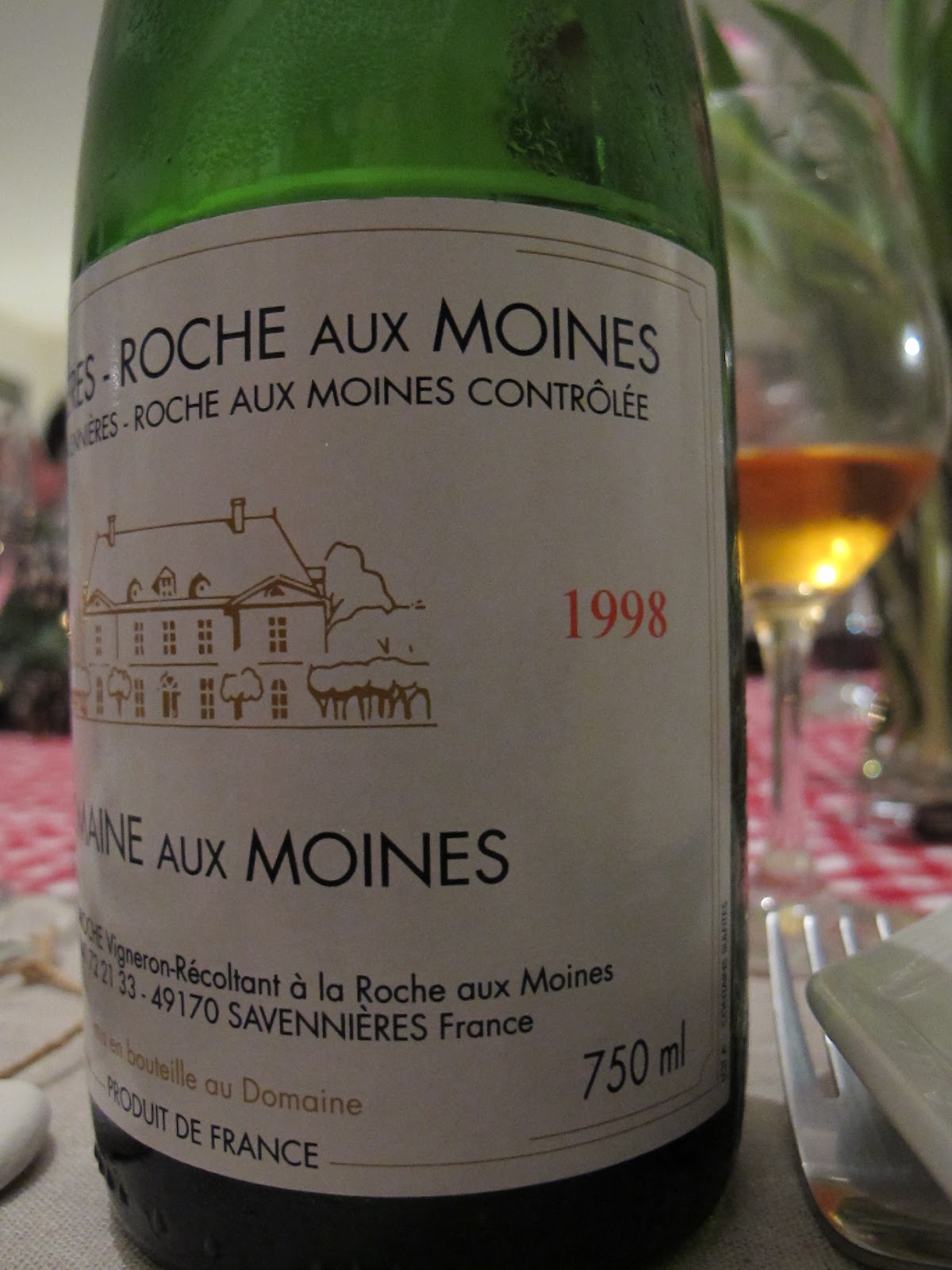 Savennières, Roche aux Moines 1998, domaine Laroche : un premier nez sur l'oxydatif ménagé, une pointe d'encaustique et de miel. La bouche est structurée, assez imposante, sur une composante minérale volcanique, la trame acide étant enrobée par un joli gras. Un chenin clairement schisteux, complexe, à la fois tendu et enrobé. Belle confrontation avec la tendreté de la chair des Saint Jacques. Finale traçante, très marquée. Très Bien +