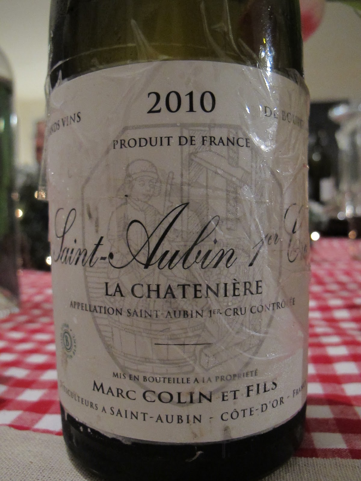Saint Aubin, premier cru la Chatenière 2010, Marc Colin et fils : changement complet de registre (quoique !) avec ce vin plus floral et plus fruité. La composante minérale est toujours présente, mais plus fine, plus grillée. Moins de structure que son ainé, mais une élégance toute chardonnesque. Amers nobles sur la peau d'amandes en finale. De la garde encore à prévoir pour ce vin. Excellent