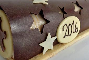 Pour la déco, une cage en chocolat noir ajourée de motifs de Noël et légèrement pailleté de poudre d'or complètent un design épuré de cette bûche gourmande.