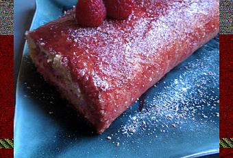 Préparer un miroir framboise pour couvrir le roulé. Faire chauffer 200 g de coulis framboise et incorporer 3 feuilles de gélatine préalablement ramollies. Laisser tiédir et verser sur le roulé. Saupoudrer de poudre de biscuits rose et décorer avec quelques framboises entières.
