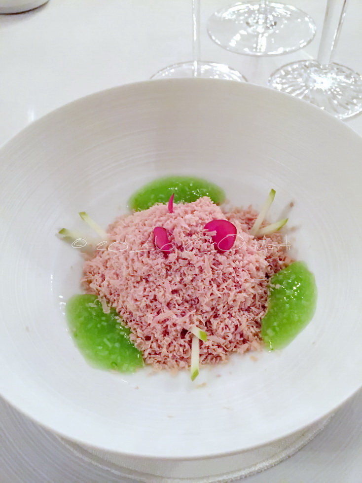 Foie gras de canard râpé, tourteau et pomme verte. Peut-être pas la présentation la plus réussie, mais un goût et mélange des textures incroyables !