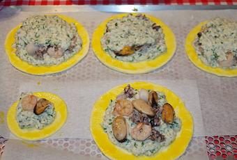 Placez la moitié de la farce de poisson sur les disques pleins jusqu'à 2cm du bord. Ajoutez les fruits de mer, couvrez du reste de farce et tassez un peu. Dorez le bord au jaune d'oeuf, déposez un disque perforé et soudez les bords. Dorez les tourtes d'un jaune d'oeuf allongé avec le lait. Déposez les noisettes dans le creux.
