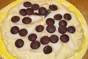 Répartir les tranches de poire sur la crème d'amandes et les saupoudrer de cannelle et de pépites de chocolat.