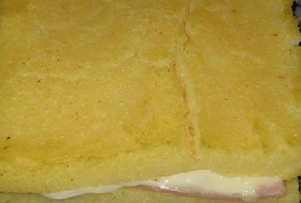 Sur la moitié des carrés, mettre un carré de jambon, une toastinette et refermer avec un carré de polenta.