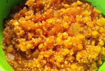 4- Rincer le quinoa et les lentilles corail sous un filet d'eau froide, puis les mettre dans la casserole avec l'eau et le sel et cuire 12 min une fois à ébullition.