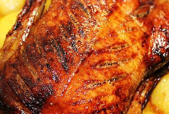 Canard rôti avec des pommes de terre, figues et romarin