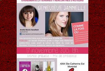 Autres invités, le 6 octobre dernier, Amélie Handfield Boivin a reçu Nicole Bilodeau (l'art de se réinventer). Le 20 octobre dernier, l'humoriste Guylaine Guay présentait son livre. Le 3 novembre c'était Denis-Martin Chabot (C'était le village). Le 1er décembre prochain Amélie recevra Martin Michaud.