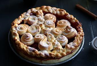 Je regarde souvent les "pies " et tourtes russes car la décoration est toujours superbe , très travaillée . Elles sont à base de pâte levée briochée avec des fruits . J'ai utilisé des cerises (surgelées) que l'on retrouve dans beaucoup de desserts russes , associées à des poires . J'ai mis une couche légère de fromage blanc . C'est plutôt , à mon goût , une tourte pour un goûter plus que pour un dessert compte tenue de la pâte briochée. Elle s'accompagne d'un bon thé et peut se déguster tiède.