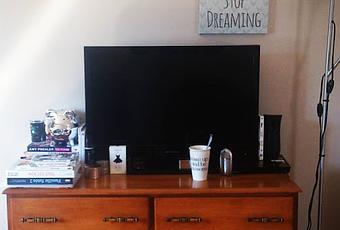Lorsque je me suis séparée et que mon ex est parti avec tout ses meubles, je me suis mise à trouver des solutions économique pour ne pas à avoir acheter trop d'ameublement. Les parents de mon oncle se débarrassait d'une belle commode en bois, j'avais déjà ma commode, néanmoins je l'ai pris. Le fameux meuble sert de meuble télé. J'avais vu quelques images sur Pinterest dans lesquels ont réutilisait des commodes et l'idée m'avait beaucoup plus. L'avantage d'utiliser une commode comme meuble télé est le rangement. Les premier tiroirs contiennent mon maquillage et mes papiers importants (facture principalement) et le restant des tiroirs contiennent DVD, Couches et lingettes pour Mini Radieuse et les deux derniers, les gros gros livres de Mini Radieuse que je ne savais pas ou les ranger. Ça donne en même temps un petit côté Shabby Chic à mon décor de salon.