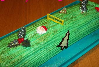 Roulez votre génoise Décoration: J'ai ajouté du colorant vert au reste de chantilly. Puis j'ai décoré ma bûche avec une poche à douille